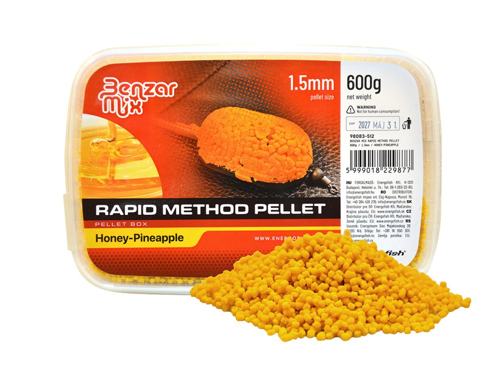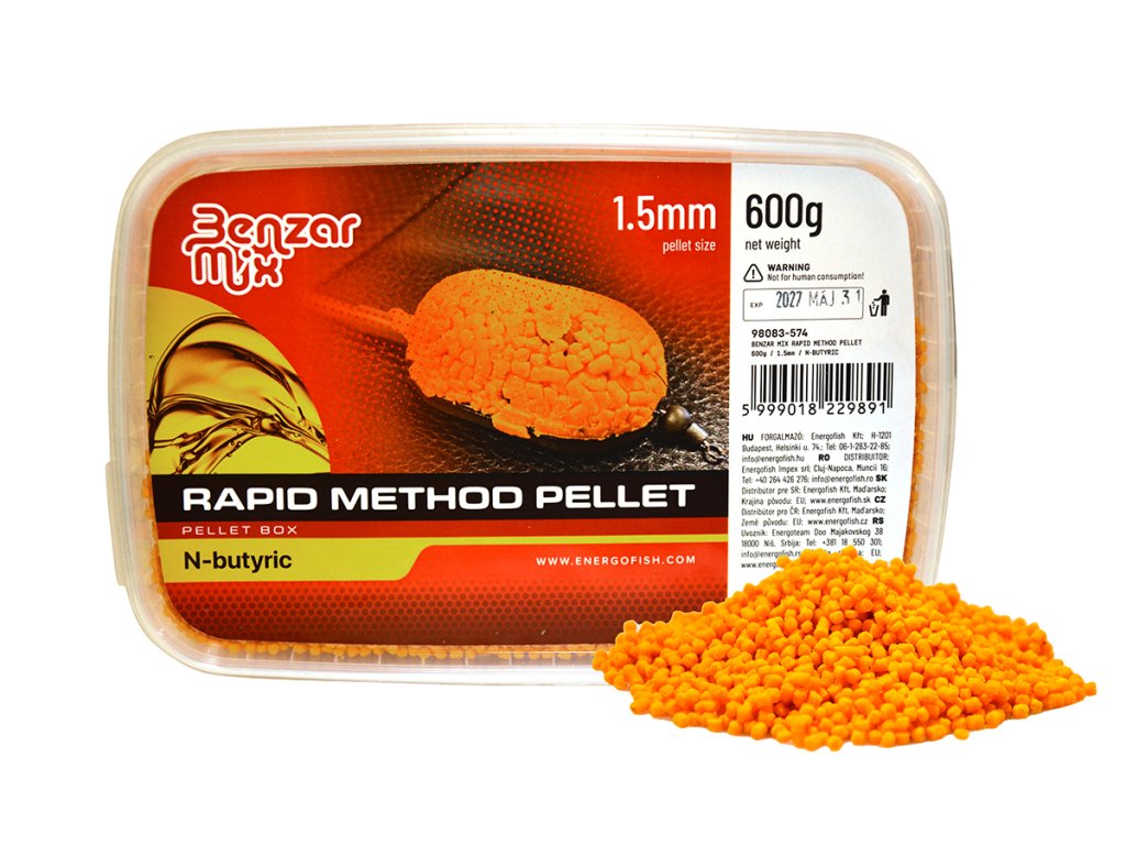 Rapid Method Pellets jsou granule na obilné bázi, takže neobsahují rybí moučku. Jejich složení zahrnuje především tradiční pochoutky kaporů, jako je kukuřice. Tyto výrobky se na police prodejen dostávají ve velmi pěkných, zářivých barvách a dvou velikostech, 1,5 a 3,5 mm.