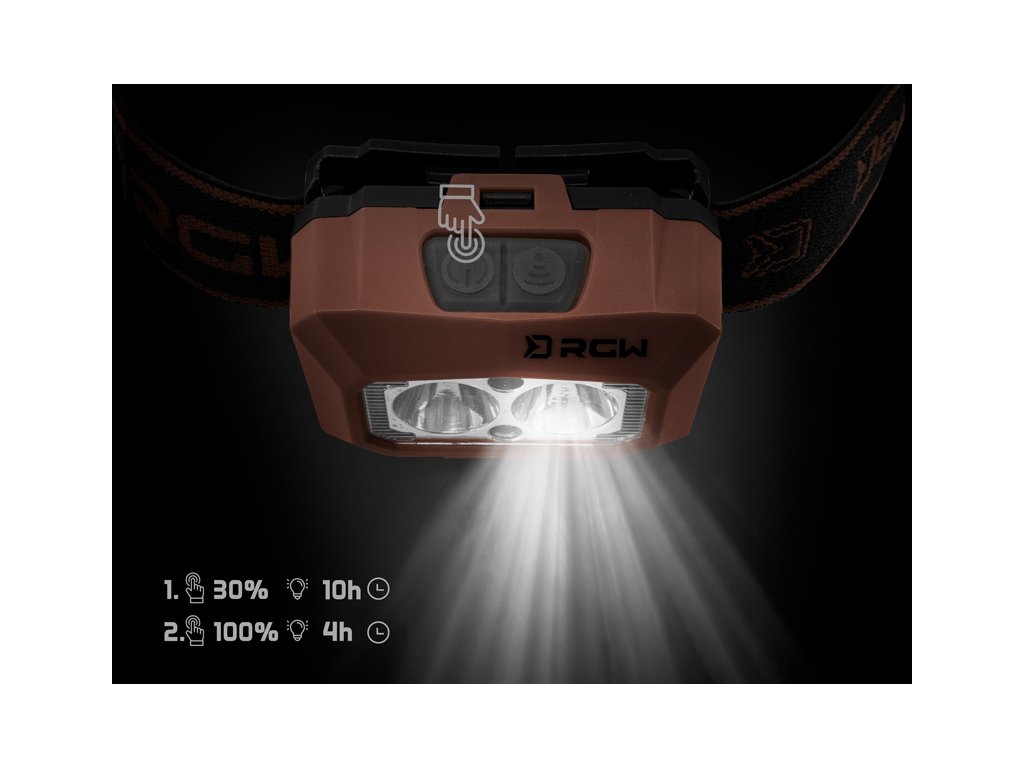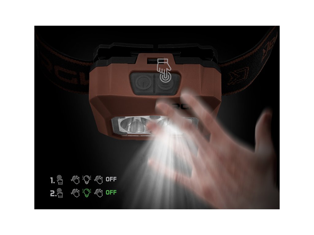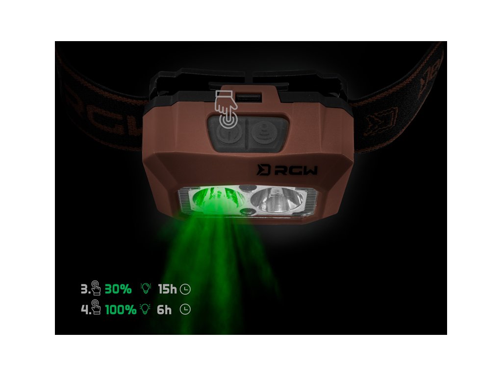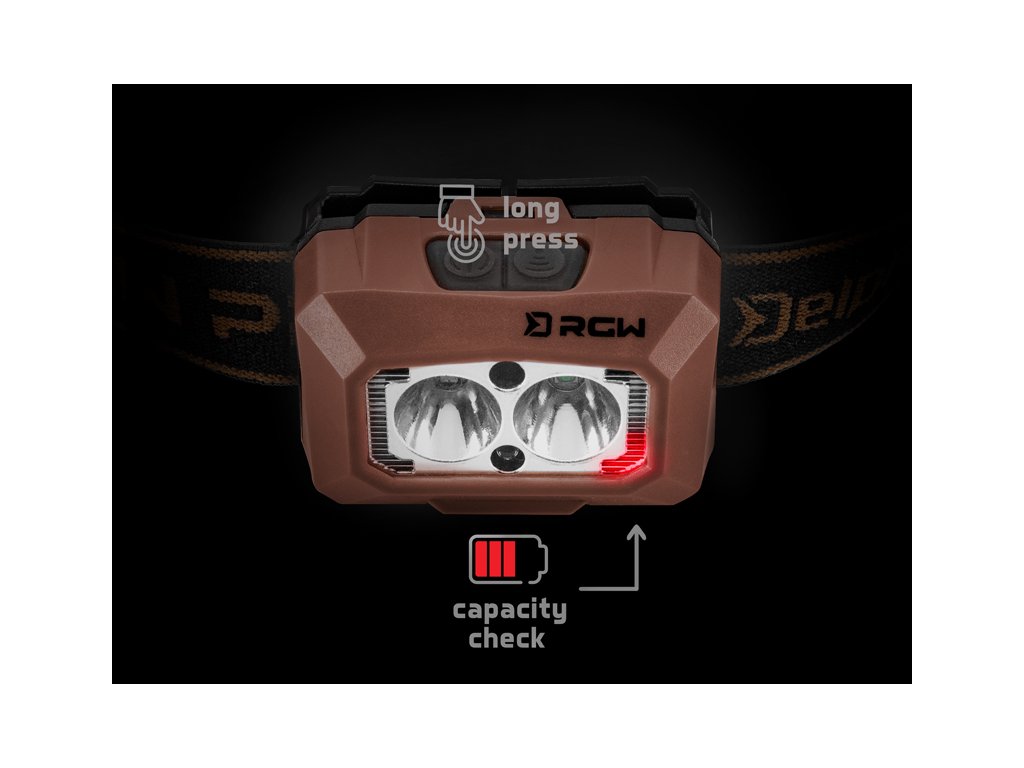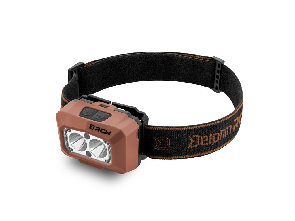 Originální, propracovaná čelovka od značky Delphin, která nabízí několik skvělých funkcí a výkon 5W se svítivostí 200lm. RWG PRO UC disponuje pohybovým senzorem a třemi barvami svícení, mezi které patří klasické bílé světlo, ale také zelené a červené. Po prvním kliknutí se čelovka rozsvítí na 30% a vydrží svítit až 10 hodin. Po druhém kliknutí svítí na 100% s výdrží 4h. Při třetím kliknutí se změní barva svícení na zelenou s intenzitou 30% a excelentní výdrží až 15h. Po 4. kliknutí svítí zelené světlo na 100% a při 5. kliknutí se na 100% rozsvítí světlo červené. Právě zelené a červené světlo nepřitahuje otravný hmyz a rozhodně ho oceníte i během zdolávání ryb, které se plaší mnohem méně než při osvícení bílým světlem. Senzor pohybu lze aktivovat pomocí druhého tlačítka a na rozsvícení lampy tak stačí před ní zamávat dlaní. Nespornou devizou je také indikace kapacity baterie, která se na čelovce rozsvítí při delším podržení spínacího tlačítka. Baterii s kapacitou 1500 mAh je možné nabíjet přes USB-C kabel, přičemž plné nabití trvá 4,5h.