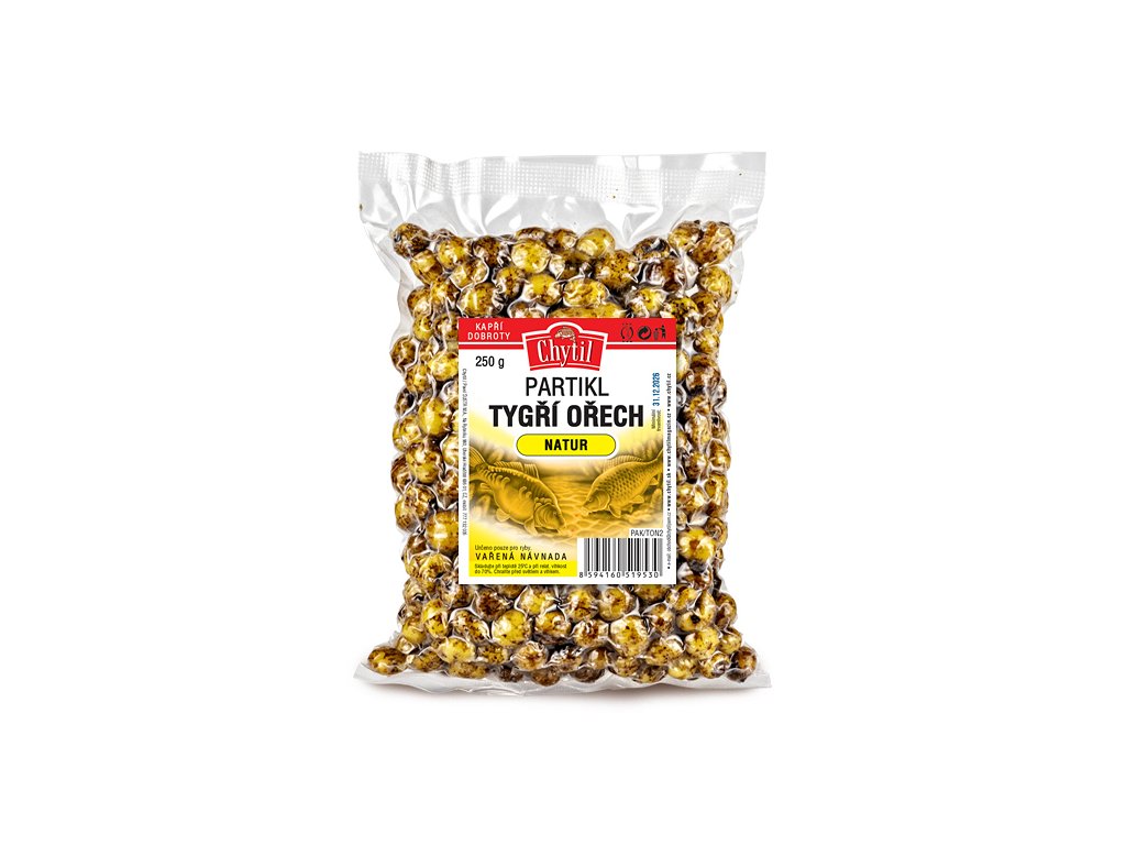 Tygří ořech – tygří ořech je léty ověřenou pochoutkou hlavně pro kapry a amury. Funguje jako skvělá návnada i nástraha. Jeho chuť je jedinečná a díky tuhé konzistenci je také selektivní. Při výrobě používáme mírnou dávku šetrného konzervantu. Vakuově baleno. Po otevření spotřebujte do 10 dní. Velikost ořechů – cca 6-10 mm.