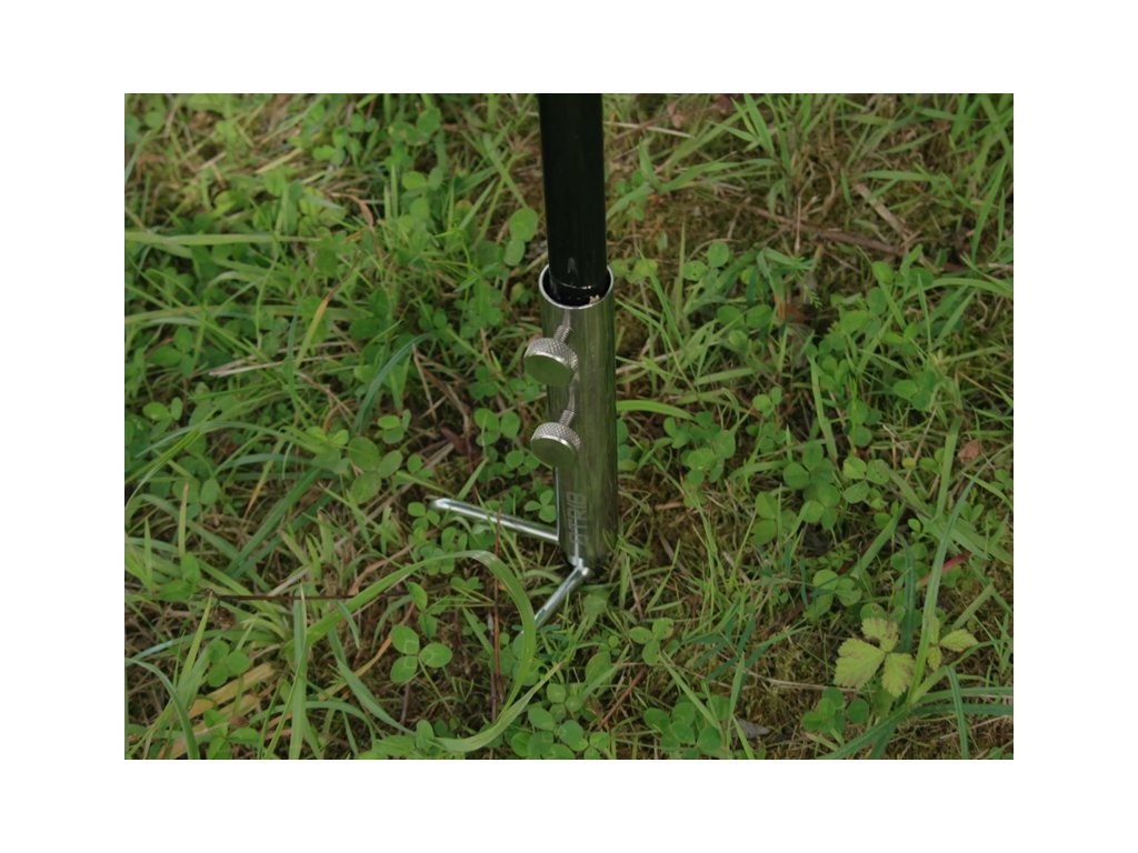 O dokonalou stabilitu se starají tři hroty, jejichž tvar vytváří praktickou plochu pro zatlačení chodidlem – díky ní držák jednoduše zapíchnete i do tvrdého podkladu. Hroty mají chromovou povrchovou úpravu, která zvyšuje jejich odolnost vůči opotřebení a korozi. Jeden z hrotů je vybaven maticí, což umožňuje nastavení jeho polohy, ale také úplné odnímání. Počet a polohu hrotů lze tedy nastavit podle potřeby, pro co nejpreciznější zafixování držáku v zemi.