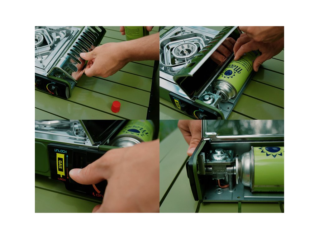 Vařič je napájen propan-butanovými kartušemi typu CP250 o objemu 400 ml. Disponuje tzv. two-stage safety systémem, díky kterému je používání maximálně bezpečné. Pro zapálení plamene je nejprve třeba kartuši zafixovat pomocí páčky na přední straně vařiče. Tím se výrazně snižuje riziko nechtěného úniku plynu nebo jeho samovolného uvolnění.