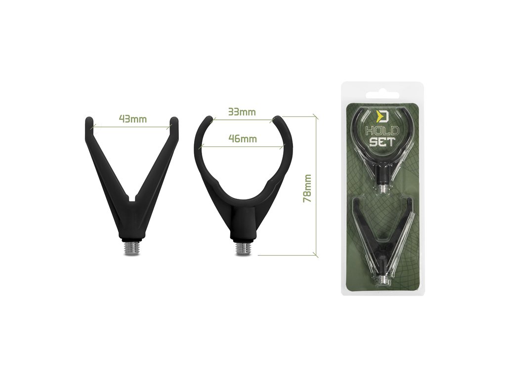 HoldSET je vyroben z odolného plastového materiálu a díky své praktičnosti a ceně jej ocení jak začátečníci tak zkušení rybáři. Zadní držák, navržený ve tvaru písmene U, umožňuje bezpečné uložení prutů s různými průměry rukojetí. Přední držák ve tvaru písmene V je opatřen drážkou, pro plynulý přechod vlasce během záběru.