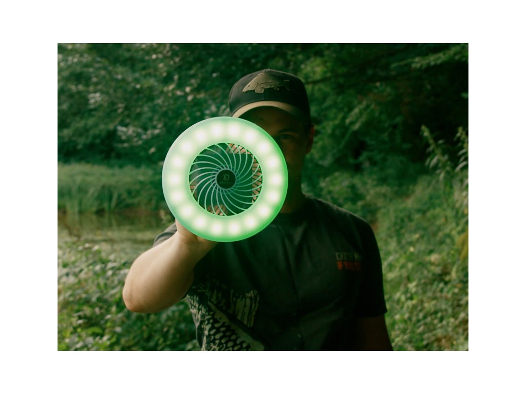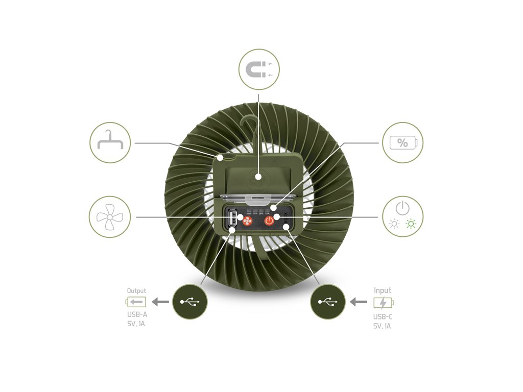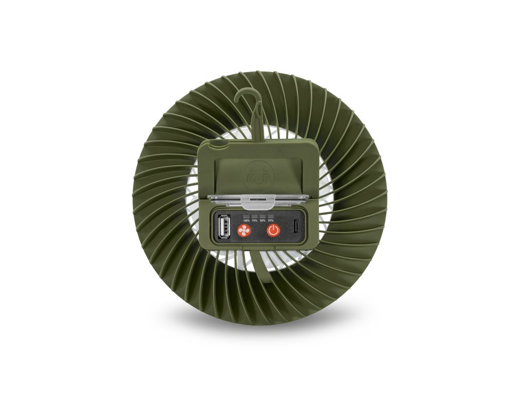 Stejně jako osvětlení, i ventilátor nabízí tři režimy intenzity, díky čemuž si jej jednoduše přizpůsobíte podle aktuálních teplotních podmínek. Prvním stisknutím se spustí ventilátor na nízkou intenzitu, při které baterie vydrží až 19 hodin. Druhý stisk zvýší výkon ventilátoru, přičemž výdrž se zkrátí na přibližně 14 hodin. Při nejvyšší intenzitě, aktivované třetím stiskem, ventilátor vydrží pracovat přibližně 11 hodin.