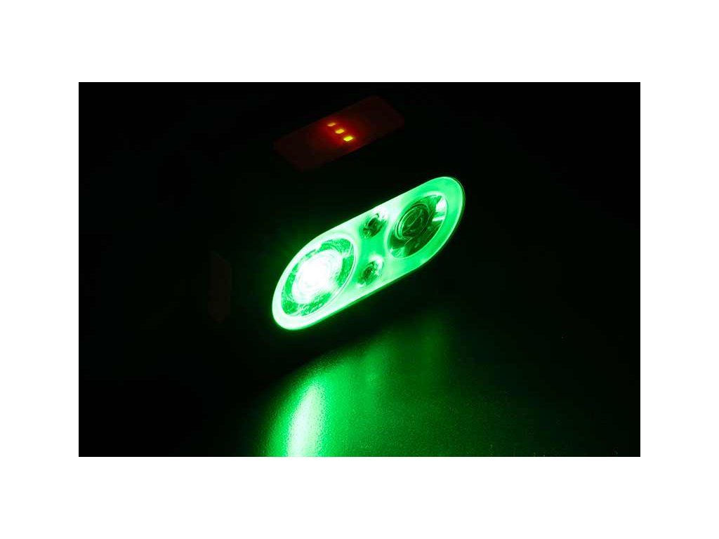 - Barevná čelovka s bílým, červeným a zeleným LED světlem.