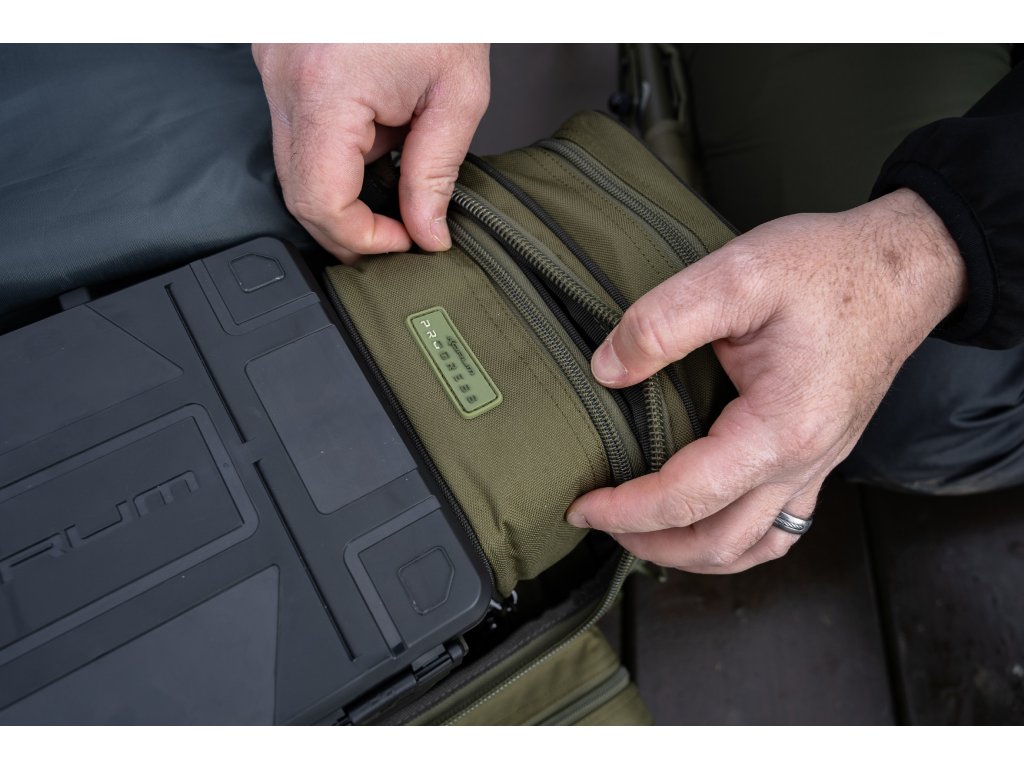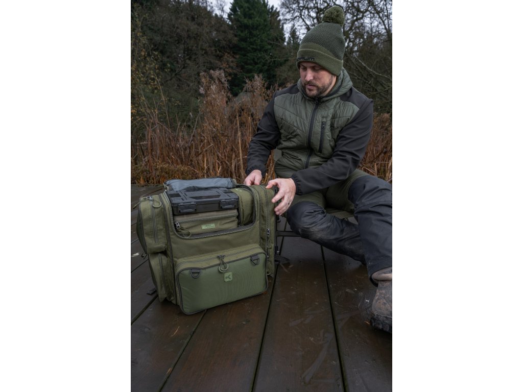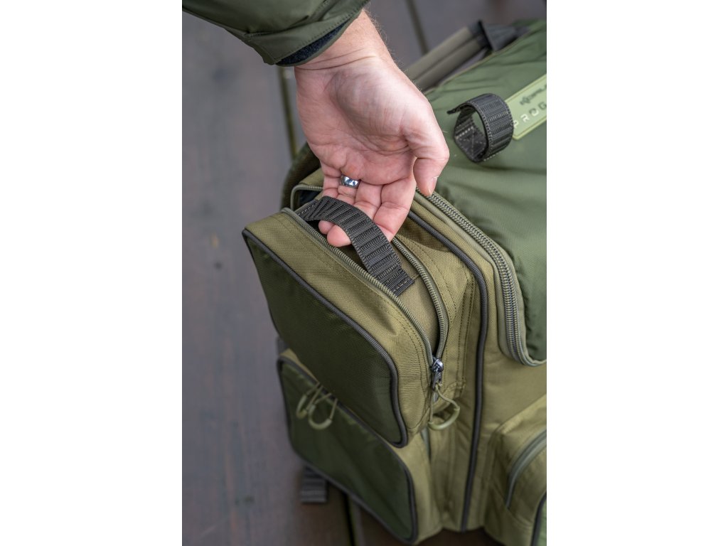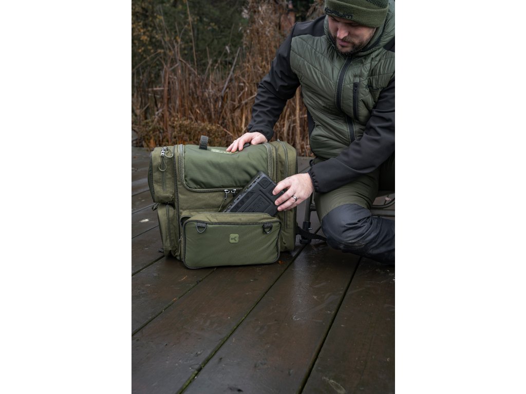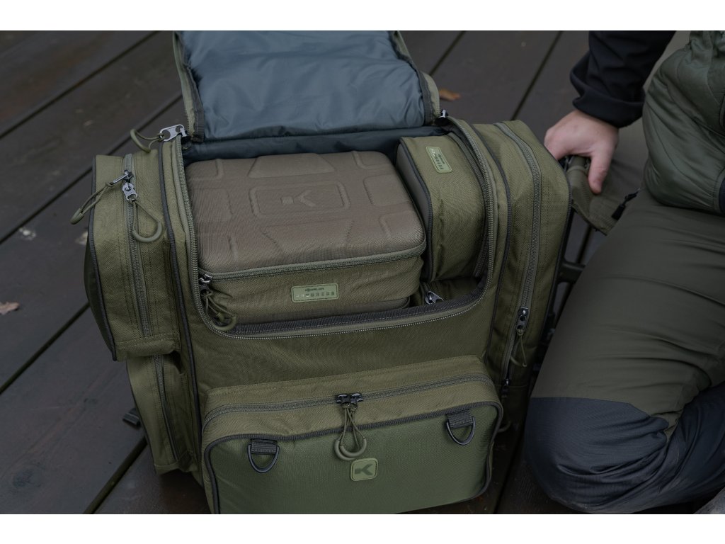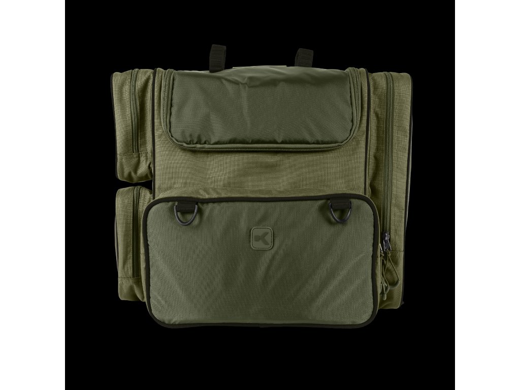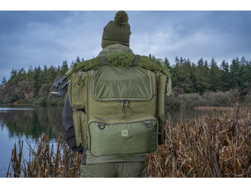 Batoh Korum Progress Rucksack 35 litrů, velkokapacitní řešení pro přepravu náčiní se strategicky umístěnými bočními kapsami.