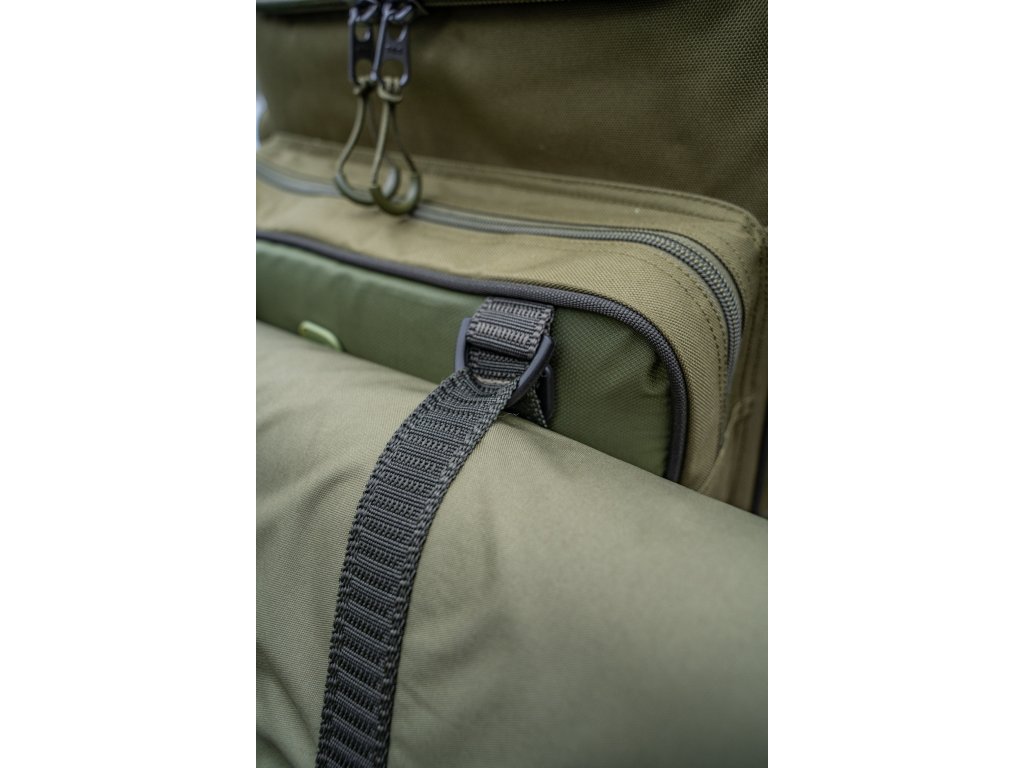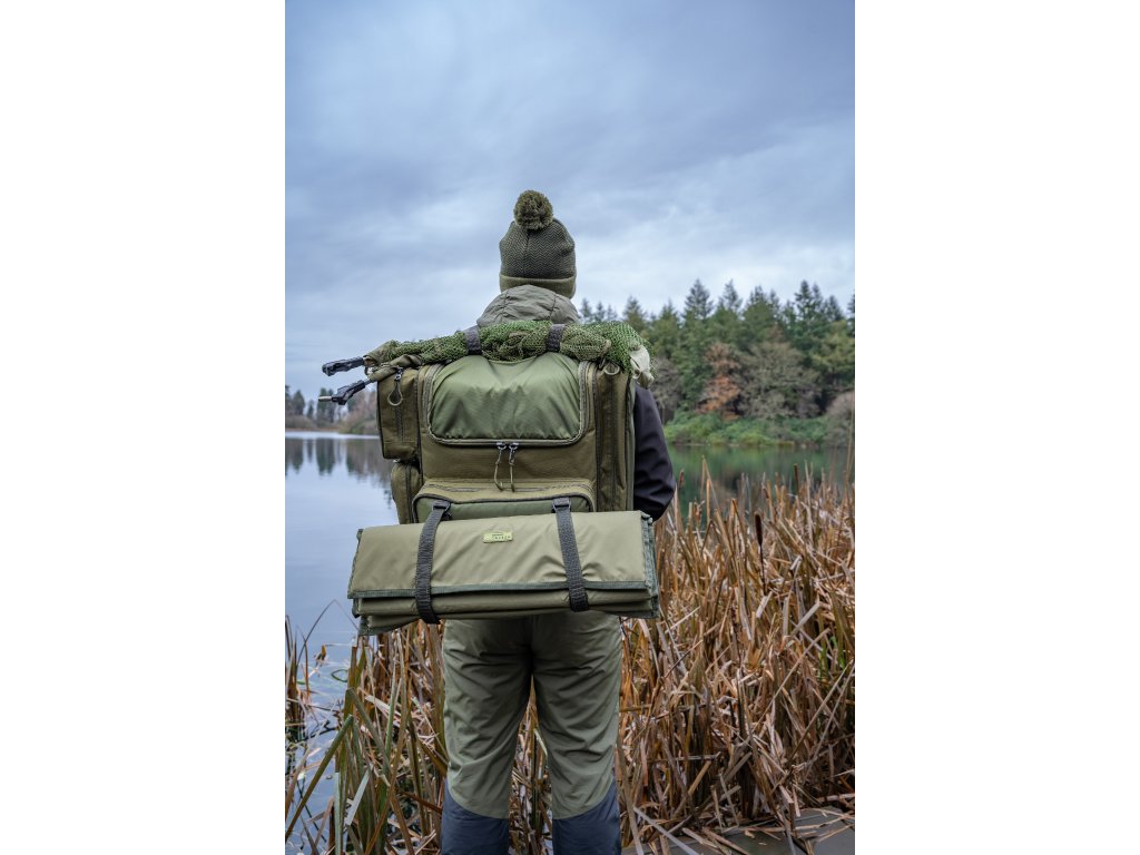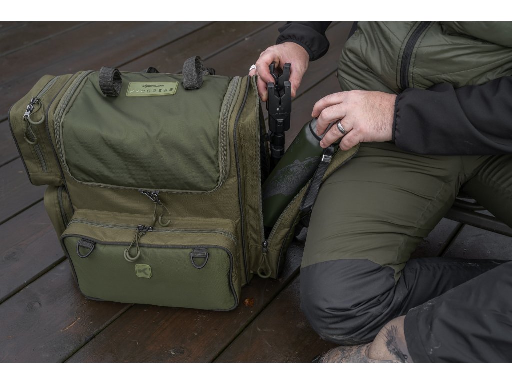 Batoh Korum Progress Rucksack 35 litrů, velkokapacitní řešení pro přepravu náčiní se strategicky umístěnými bočními kapsami. Je vybaven nastavitelným háčkem na přenášení židlí Korum, který umožňuje připevnit židle různých velikostí. S dvojicí D poutek na přední kapse pro připevnění rolovací podložky Korum Progress. Na horní straně je dvojice delších popruhů určených pro srolovanou podběrákovou síť. S polstrovanými ramenními popruhy a hrudním popruhem.