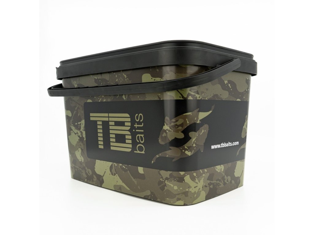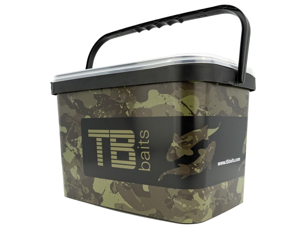 Plastový kbelík obdélníkového tvaru v designu Camo Carps od značky TB Baits.