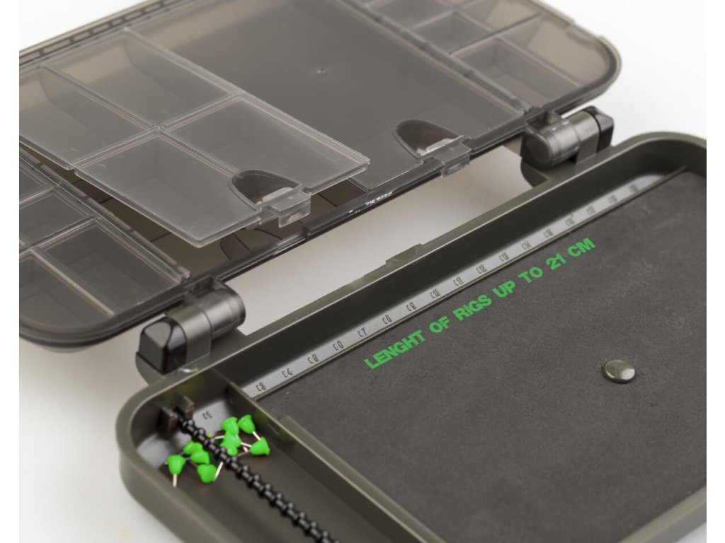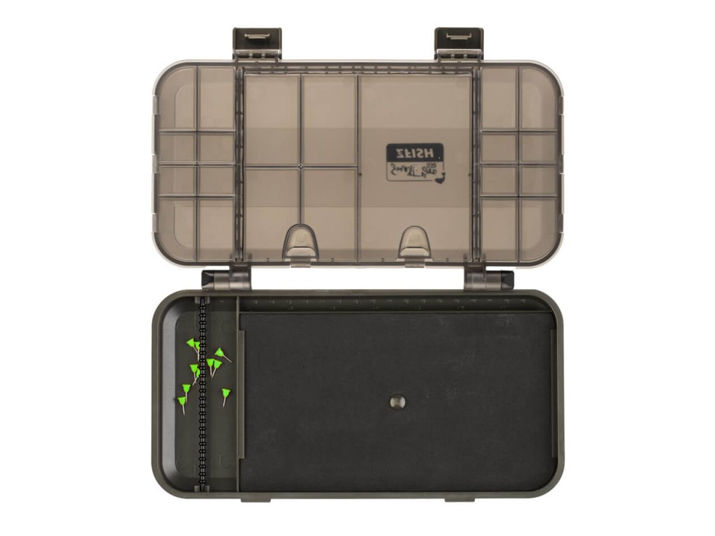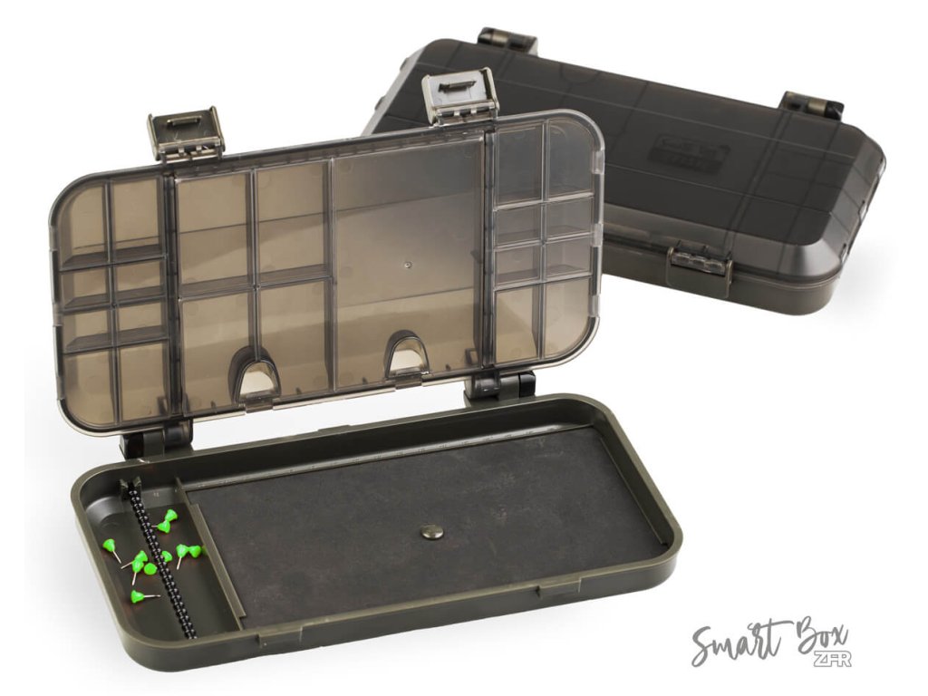 ZFISH Smart Box ZFR je praktický a univerzální organizér nebo-li tackle box od české značky ZFISH. Tento organizér je upravenou verzí oblíbeného boxu ZFS. Rozdíl spočívá ve spodní části, do které jsme umístili velkou plochu pro připevnění hotových návazců v délce až 21cm. Bezpečné uzavírání, nebo nechtěné otevření zajišťují dva zavírací klipy a velice pevné panty, které dokonce dokážou udržet box otevřený a usnadní Vám práci. Samotné víko boxu také funguje jako organizér a disponuje 21-ti menšími samostatně uzavíratelnými přihrádkami s čirými krytem, takže snadno a ihned vidíte kam a pro co sáhnout. Jednoduchý a čistý design se zkosenými a oblými hranami nejen skvěle vypadá, ale díky oblým tvarům je i samotná manipulace mnohem příjemnější. Výborný dojem už jen podtrhují odolné materiály a komponenty ve velmi elegantním, temně olivově zeleném provedení. Díky svým rozměrům se jedná o kompaktní box vhodný na kratší kaprařské nebo feeder vycházky do menších batohů.